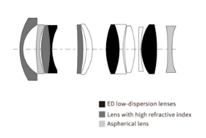 Das optische System besteht aus 3 ED-Elementen, 3 HR-Elementen und 2 asphärischen Gläsern: